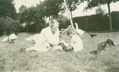 Die historische Aufnahme zeigt Wilma Krull mit ihrem Neffen Rüdiger Hebsaker, umgeben von den Hühnern der Kunststätte.